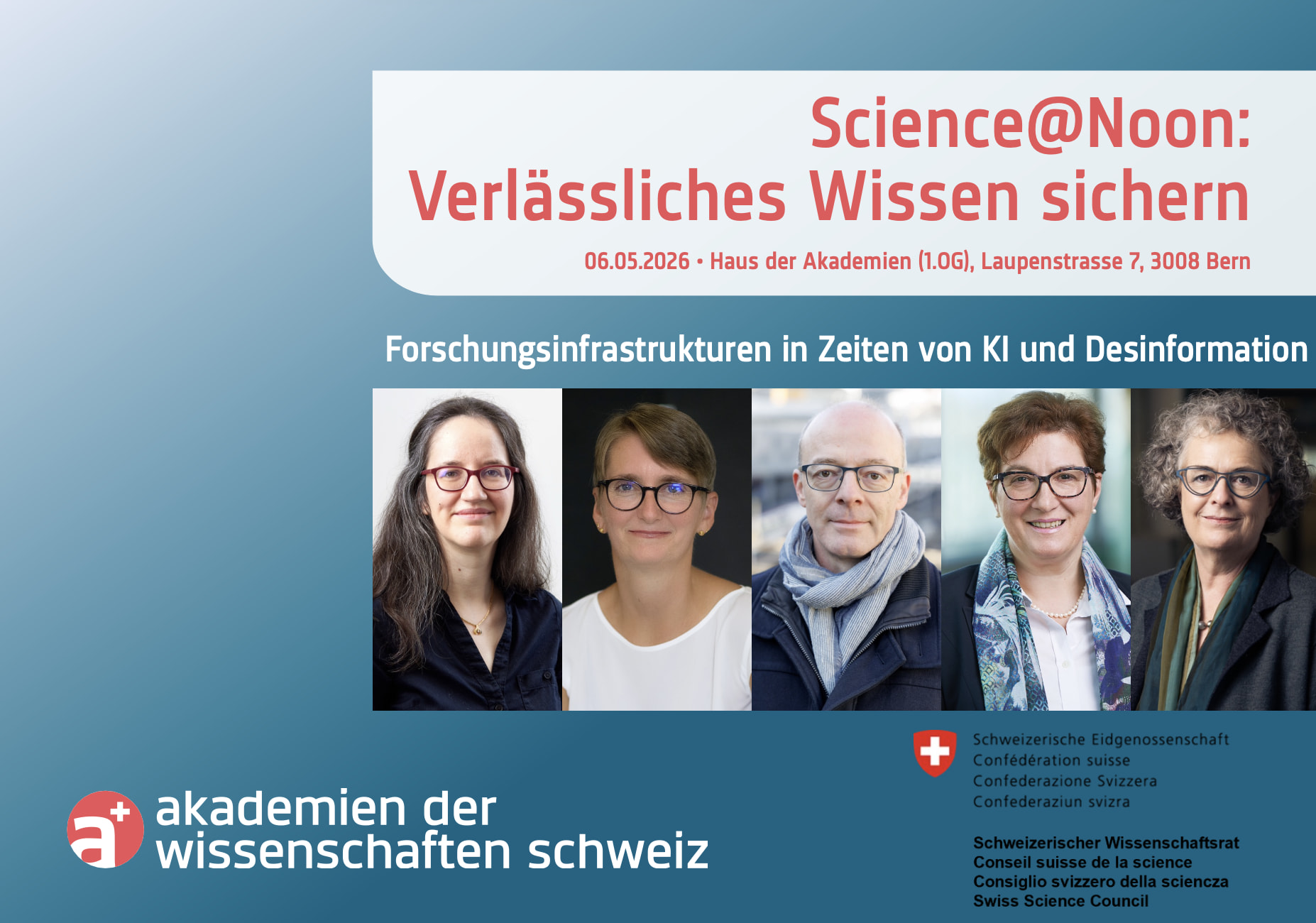 Wissen teilen, spannenden Menschen begegnen und Schnittstellen leben: Im Rahmen von «Science@Noon» diskutieren Akteure aus dem Netzwerk der Akademien der Wissenschaften regelmässig wissenschaftliche und wissenschaftspolitische Themen und geben sich gegenseitig Einblick in laufende und umgesetzte Projekte.